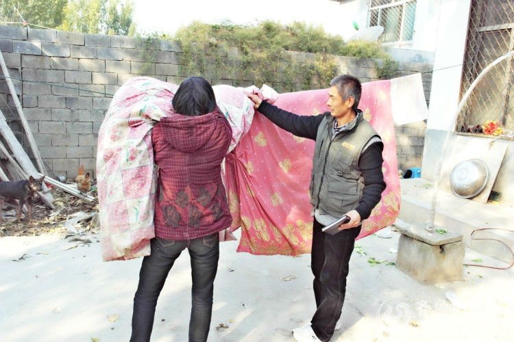 拍客马洪伟在和晒被子的双目实名的陈英交谈