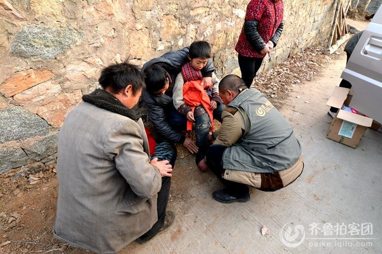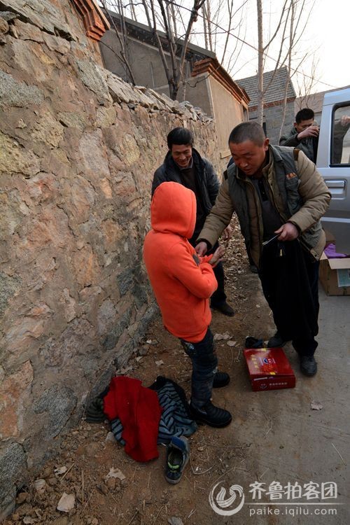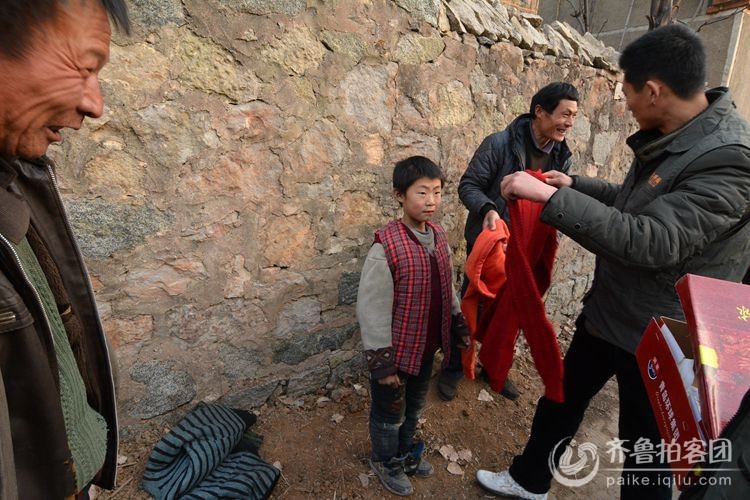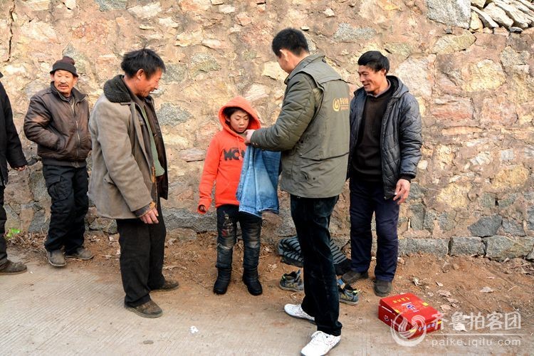 上图为:泗水拍客团工作人员为传会同学穿上爱心人士捐赠的衣服和棉鞋