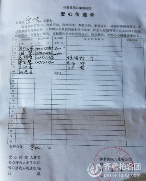 泗水微公益爱心助学 --邵先生等人助力小佳(134名) 泗水微公益发起爱心助力泗水山区贫困儿童活动以来,受到了社会爱心人士、爱心企业的广大关注和支持。2014年12月21日,又是一个冬日的周末,泗水拍客在王团长的带领下,和来自济宁的祥君孤困儿童救助团带着邵先生等人的爱心来到圣水峪乡西卸甲村小佳家。小佳,10岁家是八士庄村,现住在三姑家。父亲前几年得了偏瘫,不会说话也不能走动生活不能自理。妈妈因此撇下姊妹两个回云南去了。全靠姑姑每天送饭照顾。现在姊妹两个的生活由三姑和四姑照顾。姐姐15岁在圣水峪中学上学跟四姑一起生活。小佳上小学三年级跟三姑生活。听小佳三姑说她一家也压力也很大,她老公公也是偏瘫生活不能自理,她有三个孩子老大出嫁了。剩下一家全靠她姑父,生活也很困难。 邵学富先生现金500元、周慧阿姨现金200元、赵燕青阿姨保温杯一个、梁安慧阿姨棉冬衣一件、朱秋菊阿姨文具一套,孙先生现金100元. 爱心传递单 小佳本人 去小佳家的路上 小佳在接受棉衣、文具 邵先生救助的500元钱 小佳的父亲 小佳在爱心传递单上签名字  爱心是一首歌,让困难家庭的孩子获得心灵上的慰藉;爱心是一场洒落在久旱土地上的甘霖, 让困难家庭的孩子感到情感上的滋润;爱心是沙漠里的一泓清泉,让困难家庭的孩子看到生活的希望。人人奉献一点爱,世界将会变的更加美好。