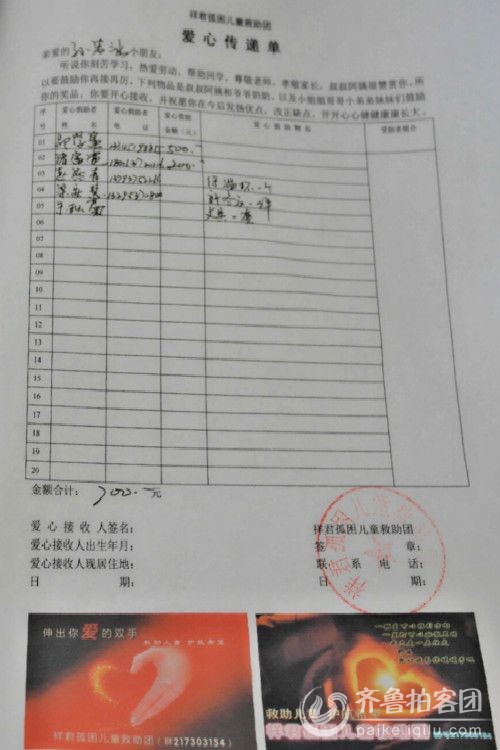 小若涵在爱心传递单上签字