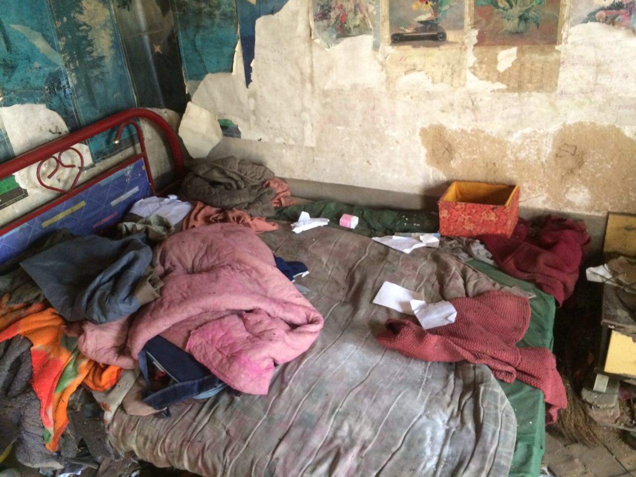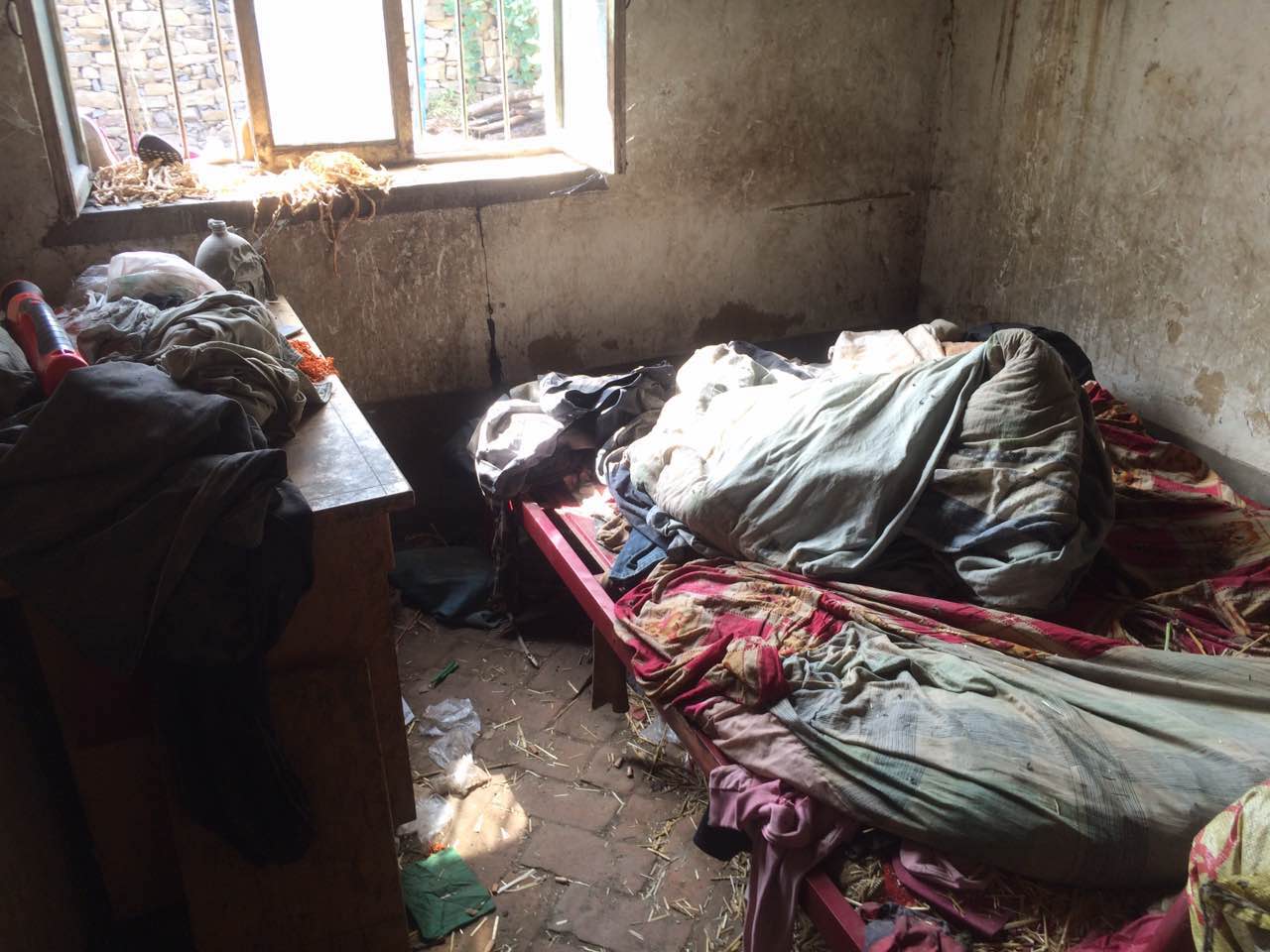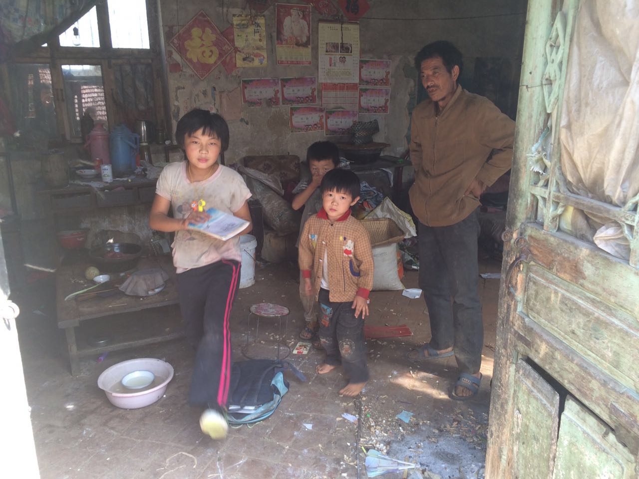我们到达小桂芝家时,家中乱糟糟的,家中只有身体不好的叔叔在家看着这三个孩子。孩子们的妈妈精神残疾在生下小桂玉后几个月就离家失踪多年了,全靠体弱多病的奶奶照顾,奶奶已经80岁的高龄了。平常父亲靠打零工维持生活。姐姐小桂芝,11岁,现在徐家庄小学上4年级,弟弟小修旺6岁上小学一年级,妹妹小桂玉5岁也已经上幼儿园了,爸爸的收入根本不能满足孩子们的正常上学开销。原本拮据的生活在接连三个孩子的降临后变得更加困难