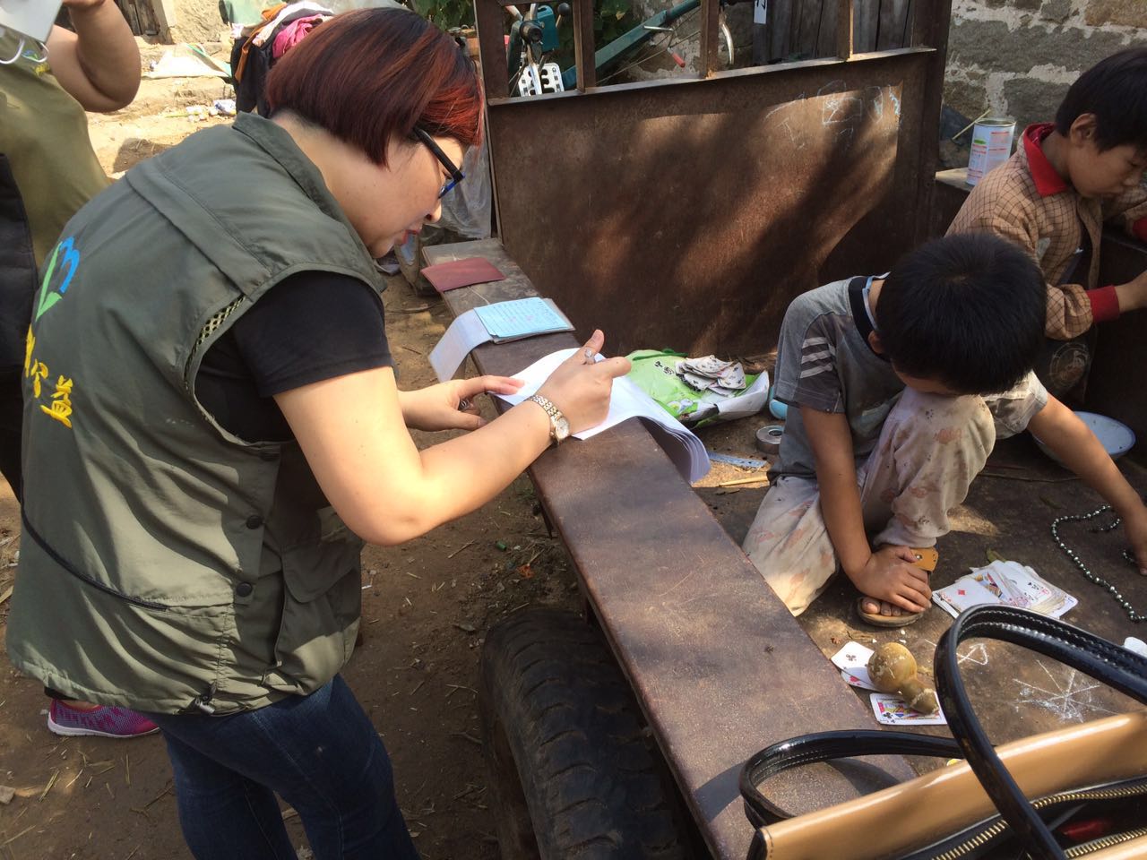 志愿者在核实登记孩子的家庭信息情况